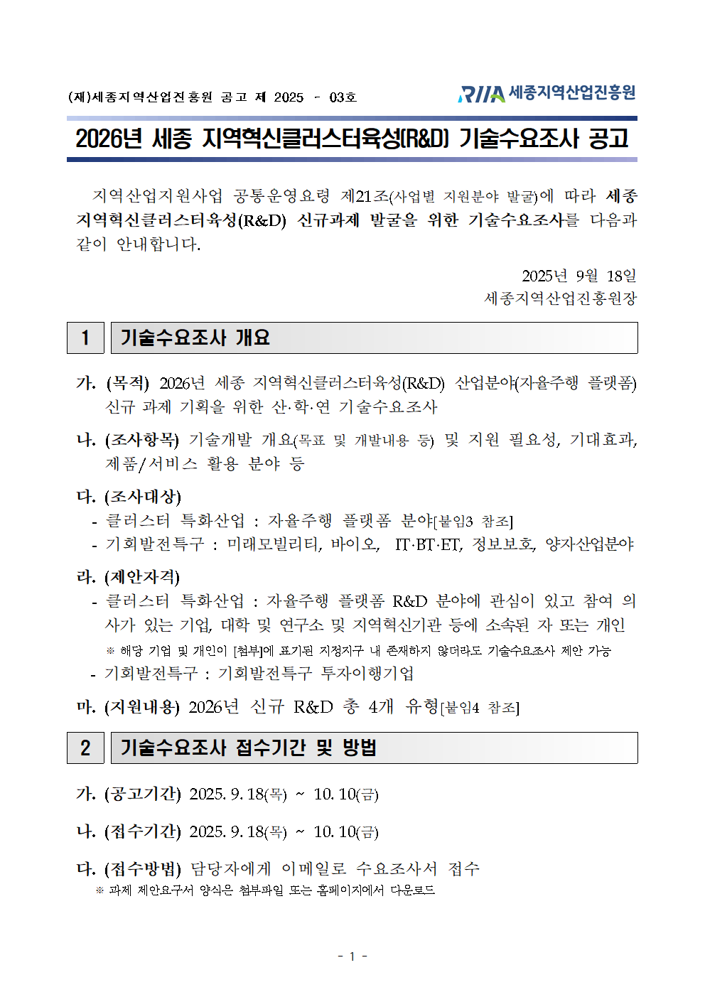 2026년 세종 지역혁신클러스터육성(R&D) 기술수요조사 공고